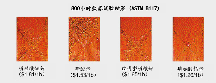 钼酸盐抑制腐蚀的能力在钢板盐雾试验中得到证实,钼酸盐可以防止试样的表面点蚀(见下图 )。