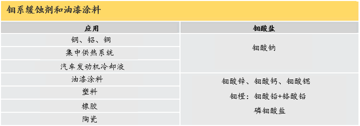 上表小结了钼酸盐作为缓蚀剂和油漆涂料的用途。可溶性钼酸盐如钼酸钠用于集中供热系统的溶液和发动机冷却液。不溶性钼酸盐用作底漆和油漆。钼酸盐如果不与有色阳离子结合或与有色化合物混合,它是白色的,因此可用作白色颜料。例如,钼酸锌,它无毒,是优异的缓蚀剂。钼橙颜料的橙色是由于铬酸盐的存在,颜料由钼酸铅、铬酸铅和硫酸铅组成,为混和晶体。铬酸铅呈黄色,而钼酸盐铬酸铅呈亮橙色。颜色变化是由于铬酸铅在钼酸盐存在下结晶时,其晶体结构发生了变化。