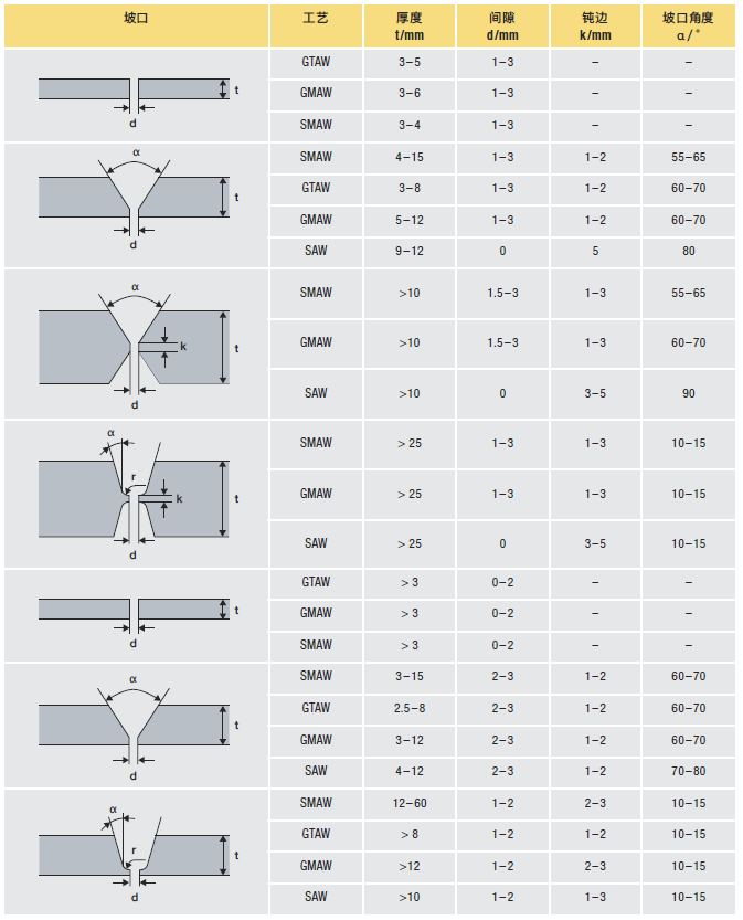 双相不锈钢的接头设计必须有助于完全焊透并避免在凝固的焊缝金属中存在未熔合的母材。最好采用机加工而不采用砂轮打磨坡口,以便使焊接区厚度或间隙均匀。必须打磨时,应特别注意坡口加工及其装配的均匀一致。为了保证完全熔合和焊透,应当去掉任何打磨毛刺。对于奥氏体不锈钢,有经验的焊工可通过控制焊炬克服坡口加工的某些缺陷。但对于双相不锈钢,这些技巧会造成材料在有害温度区间停留时间比预期的时间长,导致结果超出合格工艺要求。