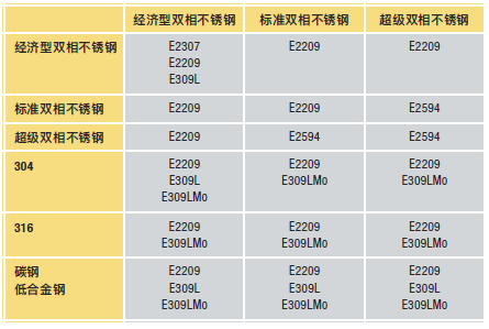 下表归纳了双相不锈钢与异种金属焊接时常用的填充金属。这些例子给出了AWS焊条牌号 (E),但是根据焊接工艺、接头形状和其他条件的不同,可考虑采用焊丝 (AWS牌号ER) 和药芯焊丝。