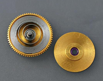 摆轮游丝(左)通过一系列齿轮连接到主发条(右),调节主发条的能量以秒为间隔恒定地释放