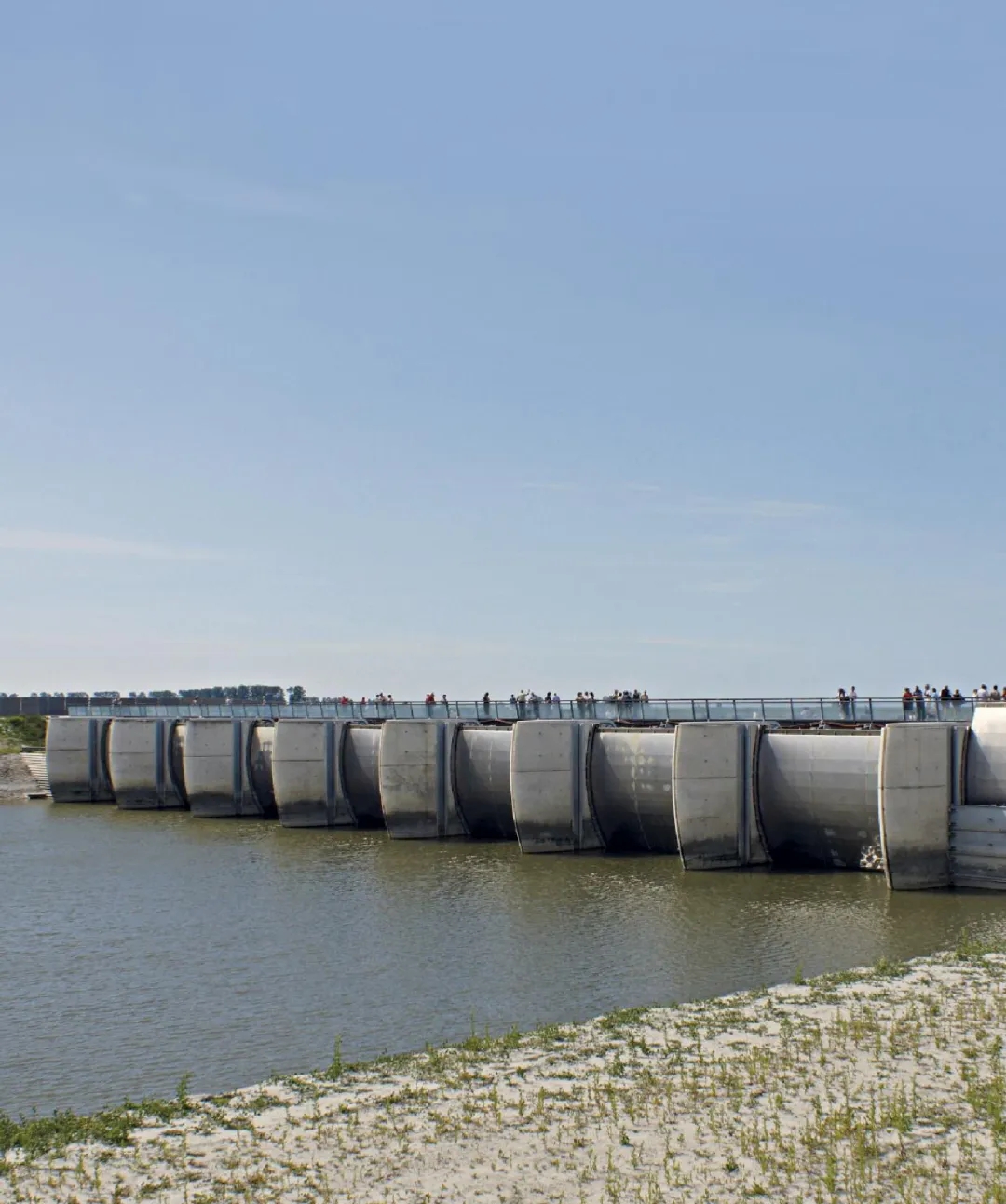在涨潮期间,略微降低旋转闸门可以使海水流过其顶部边缘,流入库士农河,同时减少泥沙涌入。在退潮期间,水闸被逐渐抬高,这样河水连同淤泥和沙子可以从水闸下流出。©shutterstock.com/Cmspic