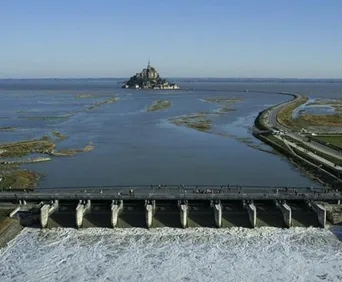 面向修道院和开放海湾的库士农大坝也已成为旅游景点。项目建筑师在大坝顶部设计了一个公共空间,可以欣赏圣米歇尔山的美景,每年吸引数百万游客参观这座被列入联合国教科文组织世界遗产名录的古迹。