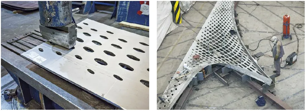 激光切割穿孔的不锈钢板在一个重型压机(左)进行三维成形。之后焊接在一起成为4个四等分。采用焊接的方式将加强轻质壳体结构的“折叠”边缘连接起来©Wilfried Dechau