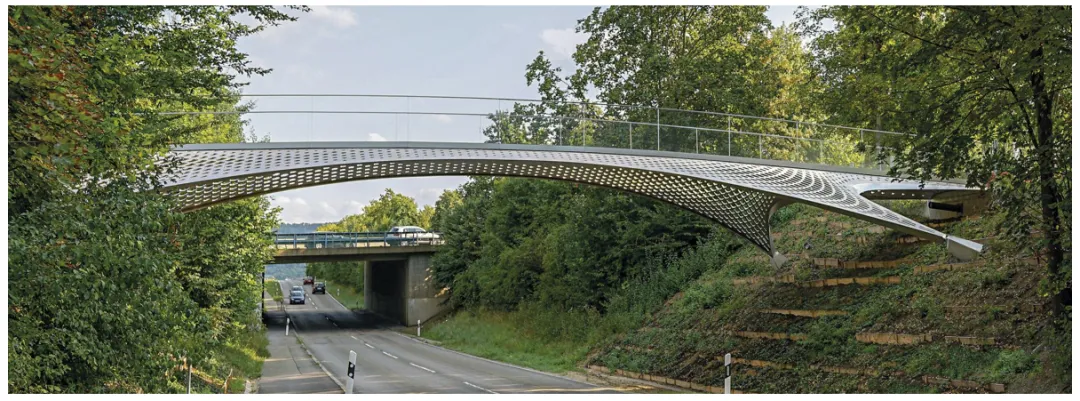 这座桥乍看上去像一块大的金属丝绸,但这座轻盈的步行桥不仅仅是漂亮,它还为实现高效及可持续的结构设计提供了新的选择。位于德国斯图加特附近迪津根的通快集团(TRUMPF),其业务不断增长并在国际上取得成功,工厂需要扩大,唯一途径是扩张到繁忙乡村道路的另一边。厂区被一分为二,从一个区域到另一个区域很麻烦,除了过马路,进出安全检查也增加了时间。这座步行桥将两个生产区域连接了起来,不仅方便了为员工和访客在厂区间穿行,也作为当前激光切割技术(公司的主要产品之一)的一个展示。
