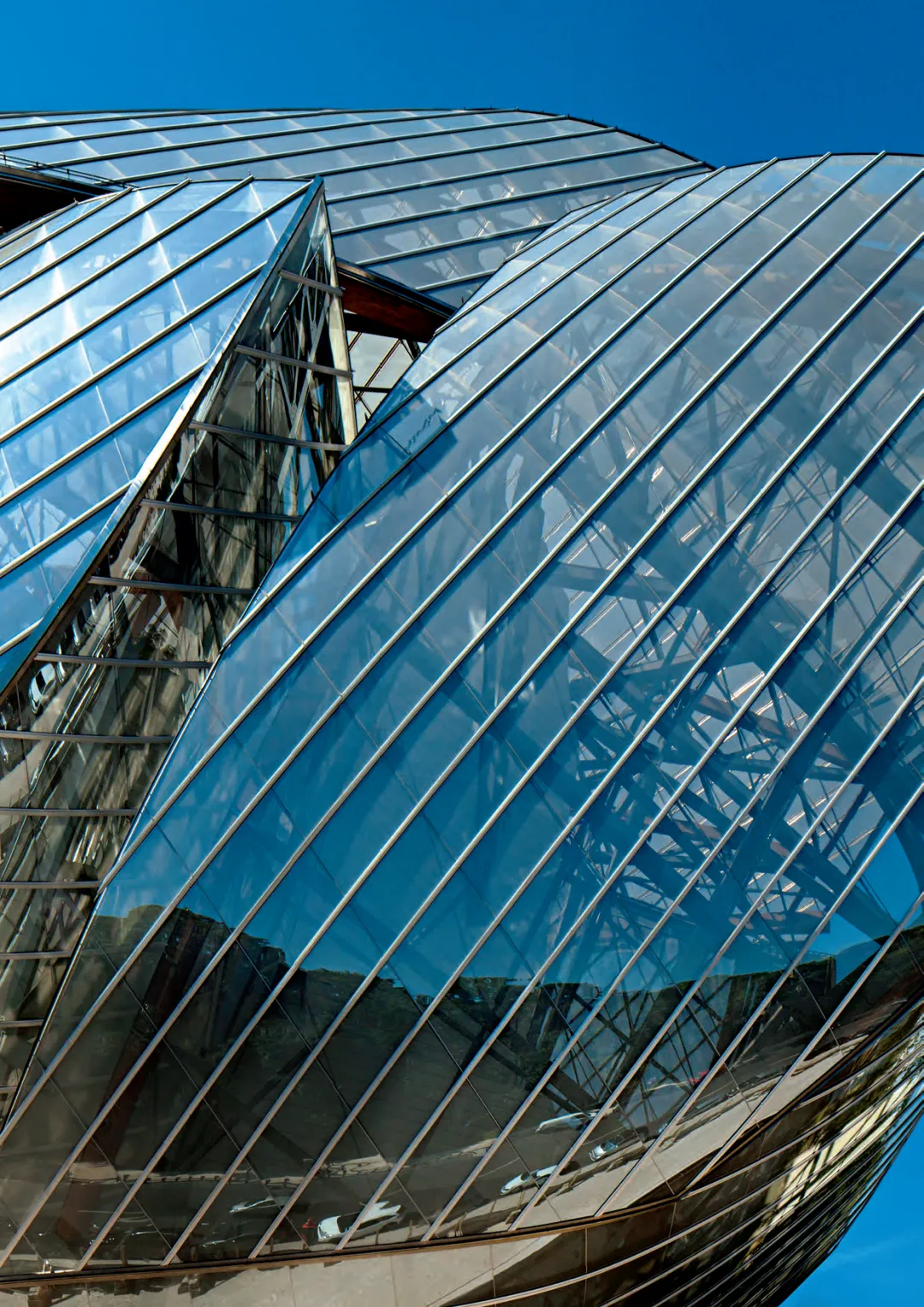 第三部分独立式结构包括十二个围绕在 “冰山” 周围和上方的曲面玻璃帆,以及支撑它们的令人赞叹的双锈不锈钢格栅。三个船帆仿佛这座建筑的三把大伞,而其他九个船帆则环绕着它,创造出一艘在布洛涅森林树梢上航行的 “幽灵船” 的外观。每个船帆重200至350吨,跨度可达30米,单个表面积从500平方米到3500平方米不等,总计13500平方米。船帆包含3584块不同厚度的玻璃曲面板,根据它们在船帆上的位置,将每块1.5米x3米的板热成型为不同的曲率。这项最初由汽车行业所开发的创新技术,避免了对每块板进行成本昂贵的定制铸造。