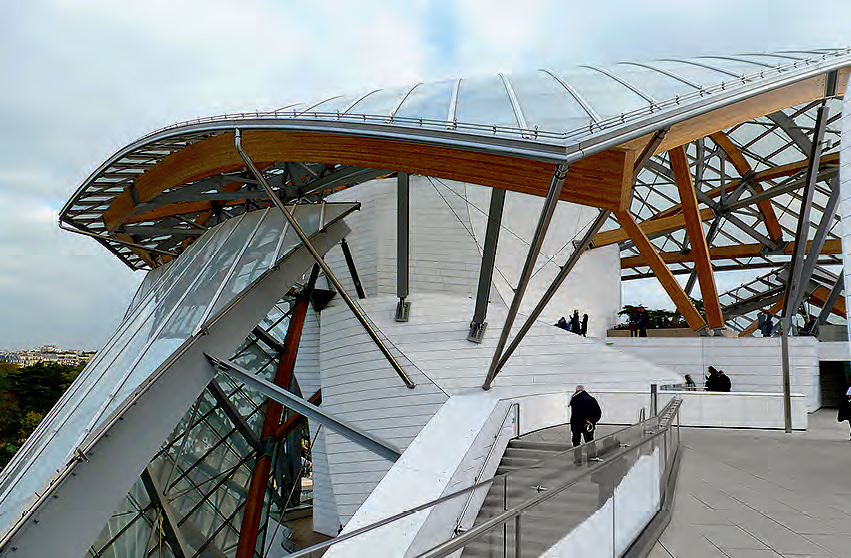 这座建筑由三个主要部分构成。主要的内部核心结构(冰山)包含了博物馆富有魅力的公共空间和交通空间、画廊空间和服务区。冰山的堆叠盒子上覆盖着大约19000块由超高性能纤维增强混凝土制成的白色Ductal®面板,其独特的曲率要求它们被单独浇筑。当游客在“冰山” 各处漫步穿梭时,可以进入几个户外露台,欣赏巴黎华美壮丽的景色。他们可以在这些露台上欣赏标志性的 “老妇人”(埃菲尔铁塔)和拥有狭窄摩天大楼天际线的拉德芳斯商业区。
