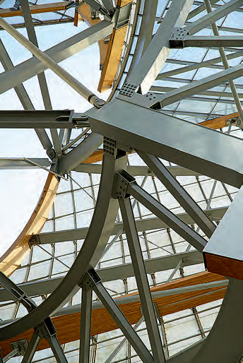 满足这件不同寻常的建筑艺术作品及其悬架所要求的一系列复杂的限制条件绝非易事。材料方面即非传统的解决方案,选用的是2205双相不锈钢(钼含量为2.5%–3.5%),而不是更常见的316L不锈钢。后者应当具有足够的耐腐蚀性来承受巴黎的大气条件。双相不锈钢耐腐蚀能力更强,主要用于腐蚀性更恶劣的环境如化工或海上石油钻井。而之所以选择双相不锈钢,是因为其最小屈服强度是316L不锈钢的两倍多。这种屈服强度上的优势转化为结构重量减少了30%。对于跨度高达30米的悬臂桁架和梁,别无选择:必须采用双相不锈钢才能胜任。其更高的强度和耐腐蚀性能实际上促使建筑师从316L不锈钢普遍转向2205双相不锈钢,尤其对于享有声誉和位于较强腐蚀性环境中的建筑结构。维护成本和美观性也是材料选择的重要因素。易于清洗的构件可由涂漆碳钢制造,但位置难以接近获得清洗的轻质悬吊格栅采用双相不锈钢建造。