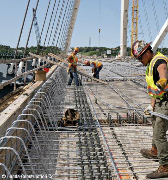 超级双相不锈钢并不是这里使用的唯一不锈钢。双子桥的混凝土桥墩、桥面和防撞栏中还使用了大量 2205 双相不锈钢作为钢筋。2205 双相不锈钢含有 3% 的钼,比旧桥所用碳钢钢筋的耐腐蚀性能高得多。钼抑制腐蚀的能力帮助桥梁达到所要求的 100 年使用寿命。
