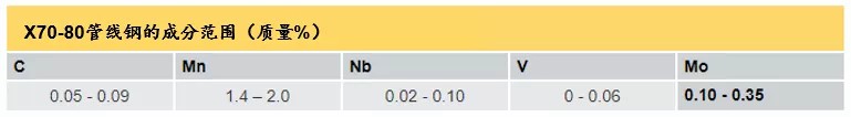 未来长距离输气管道一个明显趋势是向更高输送压力方向发展,这要求钢材具备X80的特性或更高的性能。 钢铁生产商正在这方面取得良好进展,特别是对于厚断面热轧带钢。 这里钼的回归发挥了重要作用,添加0.1%--0.3%的钼,不仅有助于生产晶粒度非常细的结构,而且还大大增强了微合金元素所带来的析出硬化效果。 此外,钼合金化帮助促进屈服曲线的连续并避免所谓的包辛格效应,这对于采用基于应变的设计规范很重要。