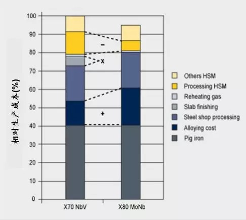 有一种观点认为钼合金化会导致成本劣势,但经过全面的成本效益分析,可以证明这种观点是错误的。将常用的NbV微合金化X70钢与当今先进的低碳 NbMo钢相比较,后者的合金元素成本确实更贵。 但是,由于后者生产工艺效率更高,质量成本更低,因此基于热轧带钢的NbMo钢制造总成本更低。 此外,NbMo合金钢的加工制造如同X80。 在项目中使用X80而不是X70,需要的钢材更少,可以大大节省成本(参见图2和图3),因为材料成本约占管道项目总成本的30%。