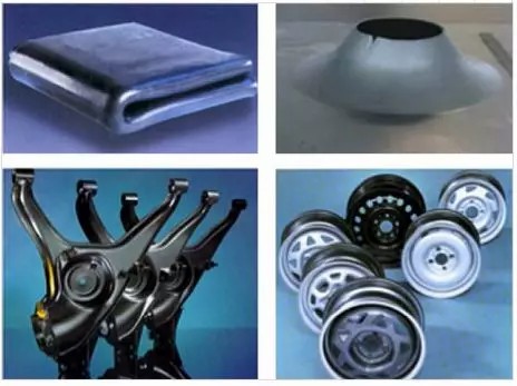 通常的Mo合金化HSLA钢表现出优异的冷成形性能,下图为测试样品表现及利用了上述优良性能的汽车部件。其中左上为多次弯曲(“手帕”)测试, 右上为扩孔试验。左下为高度变形的悬架臂, 右下为成型车轮。