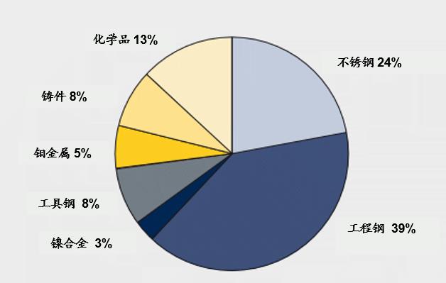 钼通常用于五大类材料:含钼不锈钢,含钼合金钢和铸铁,含钼超级合金,钼金属及合金,含钼化学品等。 2021年全球钼消费量278,640吨。钼应用领域分布图指的是从钼矿石生产出来的“新生钼“的应用分布,不包括利用化学工艺或重熔再生的废料。图中显示,新生产出来的钼,大约24%用于制造含钼不锈钢;而结构钢、工具钢、高速钢和铸铁等使用钼共计约占55%;其余的21%用于升级产品,包括镍合金、钼化合物、润滑剂级MoS2和钼金属。